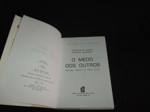 Nervoso, Timidez e Fobia Social. Capa de brochura. Tradução de João Costa. Do índice: Os nossos medos sociais e as suas manifestações, Dos medos normais aos medos patológicos, Porque temos medo dos outros?, Como vencer o medo dos outros, Avalie o seu medo dos outros, Critérios de diagnóstico da fobia social, Compreender a fobia social: o que deve saber, Combater a fobia social no dia a dia: o que deve saber.