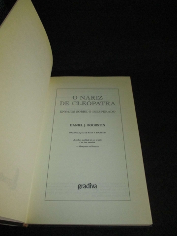 Ensaios Sobre o Inesperado. Organização de Ruth F. Boorstin. Encadernação do editor em capa dura com sobrecapa de proteção ilustrada. Exemplar com citação de Marquesa de Halifax na folha de rosto. Daniel Boorstin, vencedor do prémio Pulitzer pela obra Os Descobridores demonstra a verdade por trás do aforismo - se o nariz de Cleópatra fosse mais curto, a face do mundo teria mudado.