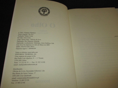 Assinatura de posse. Uma história de amor, paixão e humilhação. Capa de brochura. Preserva marcador de página. Tradução de Telma Costa. Este é o quarto romance de Nabokov. O Olho é tanto uma cómica história de detectives como um relato profundo acerca das vicissitudes das identidades e das aparências.