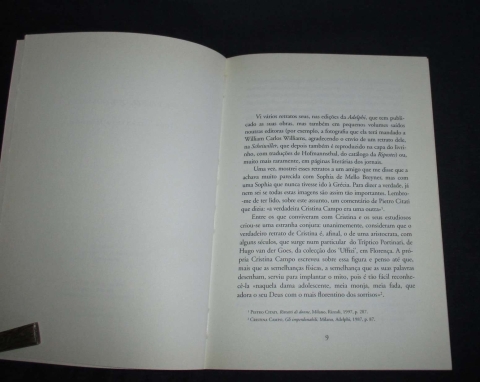 "Cristina Campo (Vittoria Guerrini, de seu nome verdadeiro) nasceu em Bolonha, em 1923, e está lá sepultada (a sua morte ocorreu em 1977). "Mas as suas cidades são outras. Florença, ali passou a juventude, teceu amizades (...) Roma, para onde se transfere, com grande sofrimento, acompanhando o pai que foi dirigir o Conservatório de Santa Cecília, e que se torna, pouco a pouco, o seu lugar da terra, amado com aquela desolada e irreversível paixão que era, talvez, a sua forma não apenas de amar, mas de viver. (...)""