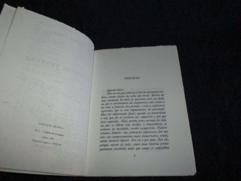 Assinatura de posse. "Escrito de uma assentada há mais de quarenta anos, na idade em que os atrevimentos são argumentos, nele deixei a nu toda a fantasia descabelada e toda a canhestrez expressiva que se tem impunemente na juventude. Mas tão embaraçado fiquei, quando na maturidade o reli, que fiz os possíveis por esquecê-lo e por que fosse esquecido”. (excerto do prefácio da segunda edição). O romance constitui um relato das aventuras de um emigrante português na China.