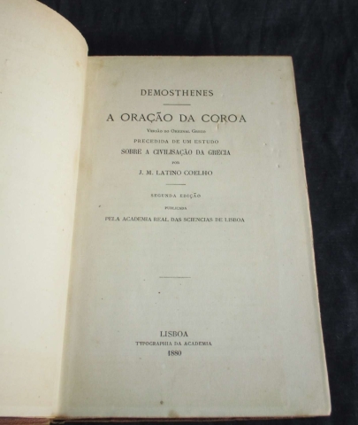 Valiosa obra de oratória política, que deve importância na cultura nacional devido ao longo estudo acerca da civilização grega que Latino Coelho aí acrescenta, para além da sua versão do discurso em que o ateniense Demóstenes (384 a.C.- 322 a.C.) se vê obrigado a assumir a sua própria defesa em tribunal.