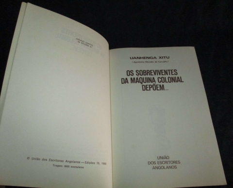 Assinatura de posse na folha de guarda. Brochado. Ilustrado com gravuras. "Uanhenga Xitu (Nome Kimbundu de Agostinho André Mendes de Carvalho) nasceu a 29 de Agosto de 1924 na sanzala de Calomboloca (junto ao Bengo). Nacionalista activo, foi preso pela polícia política do governo colonial em 1959, permanecendo no campo de concentração do Tarrafal de 1962 a 1970. Presentemente é membro do comité Central do MPLA - Partido do Trabalho e Comissário Provincial de Luanda. Tendo começado a escrever os seus contos na cadeia, é autor dos livros já publicados, 'O Meu discurso' (1974), ' Mestre Tamoda' (1974), 'Bola com feitiço' (1974), 'Manana' (1974), 'Vozes na Sanzala (Kahitu)' (1976), 'Mestre Tamoda e outros contos (1977) e 'Maka na Sanzala' (1979). Num cenário de contradições entre as mentalidades de, por um lado, os velhos colonos apoiados nas autoridades coloniais que vigiavam pela perpetuação da exploração e, por outro, um jovem enfermeiro recém-vindo de Portugal, 'Os Sobreviventes da Máquina colonial depõem...', fez denúncia profunda e reveladora dessa monstruosidade que foi o trabalho de contrato."