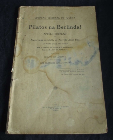 Lombada com desgaste. Supremo Tribunal de Justiça. Pilatos na berlinda! ou appêlo supremo de Maria Luísa Jacobetty de Azevedo Alves Reis aos juizes que se não vendem nem ao "Banco de Angola e Metrópole" nem ao "Banco de Portugal". Minuta de Agravo pelo Advogado José Soares da Cunha e Costa. Publicação com interesse para a história do escandaloso e muito complexo caso "Angola e Metrópole".