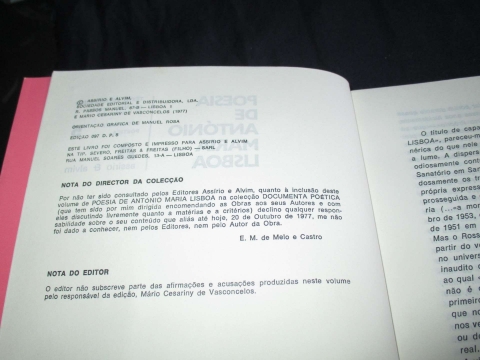 Livro polémico que faz com que E. M. Melo e Castro, director da Colecção referir o seguinte: "Por não ter sido consultado pelos Editores Assírio e Alvim, quanto à inclusão deste volume na Colecção Documenta Poética, (...) declino qualquer responsabilidade sobre o seu conteúdo..."