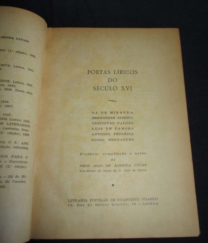 Prefácio, compilação e notas do Prof. João de Almeida Lucas Vice-Reitor do Liceu de D. João de Castro. Compilação muito cuidada de poesias de Sá de Miranda, Bernardim Ribeiro, Cristóvão Falcão, Luís de Camões, António Ferreira e Diogo Bernardes. Rubricado do anotador, João de Almeida Lucas.
