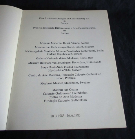 «A Primeira Exposição-Diálogo sobre a Arte Contemporânea na Europa», organizada com o apoio do Conselho da Europa, juntou em Lisboa obras das coleções de oito museus europeus, entre 28 de março e 16 de junho de 1985, período em que registou 49 010 visitantes. Integraram esta exposição conjunta as seguintes instituições: Museum Moderner Kunst (Viena, Áustria), Museum van Hedendaagse Kunst (Ghent, Bélgica), Nationalgalerie Staatliche Museen Preußische Kulturbesitz (Berlim, República Federal da Alemanha), Galleria d'Arte Moderna (Roma, Itália), Museum Boijmans Van Beuningen (Roterdão, Países Baixos), Sonja Henie-Niels Onstad Foundations (Oslo, Noruega), Moderna Museet (Estocolmo, Suécia), Centro de Arte Moderna da Fundação Calouste Gulbenkian (Lisboa, Portugal). Foram ainda convidados a participar, mas não aceitaram, a Tate Gallery (Londres, Reino Unido), o Centre Georges Pompidou (Paris, França), o Louisiana Museum of Modern Art (Humlebæk, Dinamarca) e o Kunstmuseum Basel (Basileia, Suíça). (André Silveira)