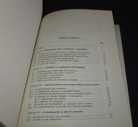 Do índice: Problemática sobre o matrimónio e especulações; A polémica e os argumentos dos polemistas; Aspectos positivos das estruturas tribais na época remota; O alambamento ou dote de casamento; A constituição das estruturas tribais; A evolução histórica do grupo família ao lar familiar; Na esteira do Evangelho; No caminho de novos horizontes; Nas nações de expressão portuguesa; As grandes lições da História.