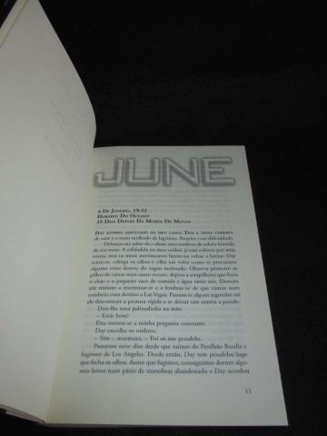 Os opostos perto do caos. Carimbo de "Oferta". Capa de brochura. Preserva marcador. Tradução de Filipa Aguiar. Trilogia Legend. Depois de fugir aos militares da República em Los Angeles, June e Day chegam a Las Vegas no momento em que algo inesperado acontece: o Elector Primo morre, e o seu filho, Anden, assume o comando da nação. Com a República da América à beira do colapso, os dois unem-se ao grupo de rebeldes conhecidos como Patriotas. Dispostos a ajudar Day a encontrar Eden, o seu irmão mais novo, e a levá-los em segurança até às Colónias, os Patriotas têm apenas uma condição: June e Day devem assassinar o novo Elector Primo.