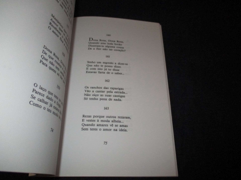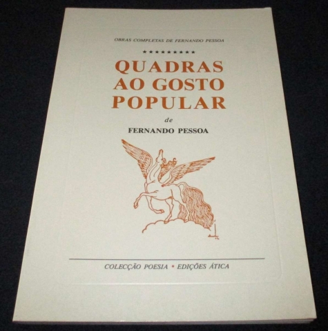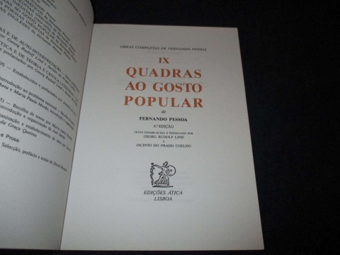 Assinatura de posse na folha de guarda. «As quadras populares e os «Poemas a Lili», que oferecemos nesta edição aos amigos de Fernando Pessoa, estavam esquecidos na famosa arca do poeta. Um envelope verde com o rótulo «quadras» continha 60 folhas manuscritas, cobertas de uma letra em pequena parte caligráfica, na maior parte, porém, mal legível; sem a ajuda da minha mulher e, na fase final, de Jacinto do Prado Coelho, a minha transcrição teria permanecido incompleta. (...)»