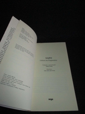 Líricas em fragmentos. Tradução e apresentação de Pedro Alvim. Desenhos de Alves da Costa. Edição Bilingue. Uma ilustração de Alves da Costa. Ilustração a cores.
