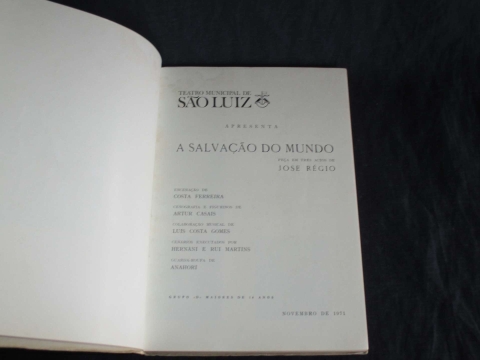 Tragicomédia em três Actos. Texto Integral. Capa de brochura. Ilustrado no texto sobre papel couché com fotografias a preto e branco. Teatro Municipal de São Luiz apresenta... Peça em três actos. Encenação de Costa Ferreira. Cenografia e Figurinos de Artur Casais. Colaboração Musical de Luís Costa Gomes. Cenários executados por Hernâni e Rui Martins. Guarda Roupa de Anahori.