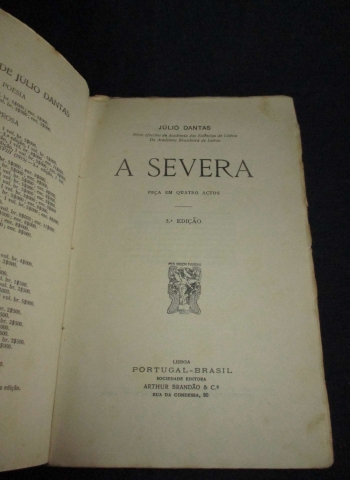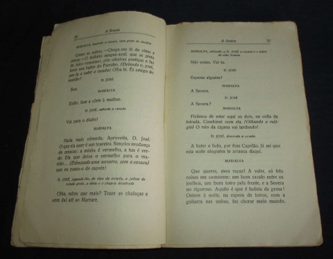 Assinatura de posse. Capa de brochura ilustrada por Alberto de Souza. Peça em quatro actos. Foi primeiro publicada enquanto peça de teatro em 1901 no antigo Teatro D. Amélia, de Lisboa. Profundamente realista, A Severa usa o calão lisboeta, de uma linguagem propositadamente baixa, aproximando o leitor dos ambientes e personagens descritos.