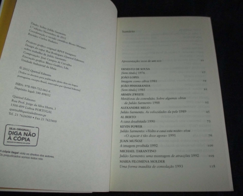 Pretende ser uma narrativa sobre a obra de Julião Sarmento, uma porta de entrada para o seu universo, se quiserem, e que conta com o contributo de críticos, curadores, escritores, realizadores, cientistas nacionais e estrangeiros - tem uma particularidade altamente intencional: à exceção da capa, não tem uma única reprodução de nenhum dos seus quadros, fotografias ou instalações, pretendendo, assim, projetar no leitor uma premissa fundamental da obra de Sarmento - a promessa sempre adiada em mostrar o que não pode ser visto.