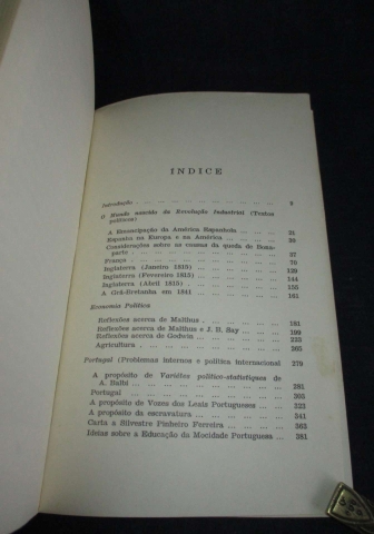 Do índice: O Mundo Nascido da Revolução Industrial (Textos Políticos); Economia Política (Malthus, J. B. Say, Agricultura); Portugal (problemas internos e política internacional): A. Balbi, vozes dos leais portugueses, escravatura, carta a Silvestre Pinheiro Ferreira, Ideias sobre Educação da Mocidade Portuguesa.