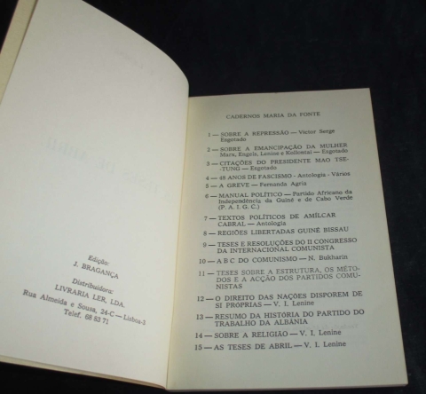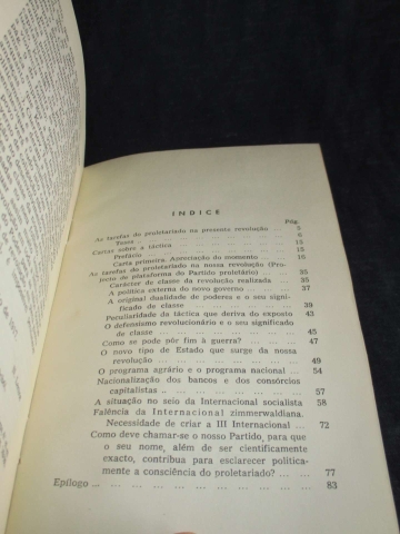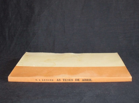 Capa de brochura. "Tendo chegado apenas durante a noite de 3 de Abril, é natural que, só em nome próprio e com as consequentes reservas, devidas à minha insuficiente preparação pude pronunciar, na assembleia de 4 de Abril, uma comunicação sobre as tarefas do proletariado revolucionário. A única coisa que podia fazer para me facilitar o trabalho, era preparar umas teses por escrito. Li-as e e entreguei o texto ao camarada Tsereteli. Li-as muito lentamente e por duas vezes: primeiro na reunião dos bolcheviques e, depois, na dos bolcheviques e mencheviques."