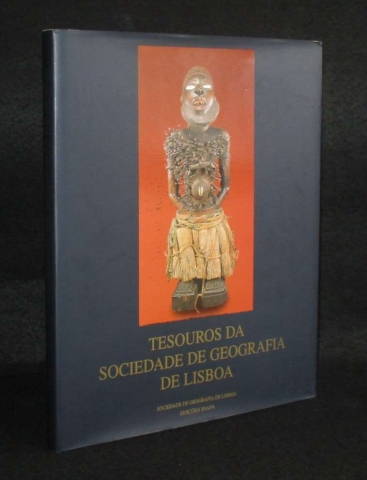 Encadernação em capa dura em tela azul escura com sobrecapa ilustrada. Catálogo publicado por ocasião dos 125 anos de existência da Sociedade de Geografia de Lisboa, descreve-nos a a história da SGL e mostra-nos 143 imagens do espólio desta instituição (cartografia, quadros, fotografias, esculturas, máscaras, etc.) que são de grande valor histórico e estético, acompanhados de textos descritivos..