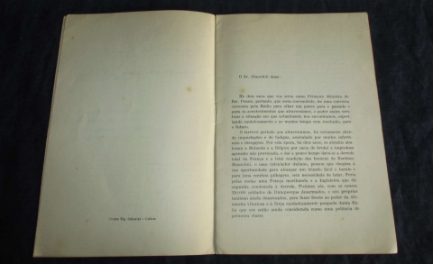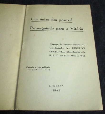 Alocução do Primeiro Ministro da Grã-Bretanha, Snr. Winston Churchill, rádio-difundida pela B. B. C. em 10 de Maio de 1942. (Segundo o texto publicado pelo jornal «The Times»). Brochura com 16 páginas.