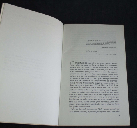 "Comemora-se hoje, dia 4 de Junho, o oitavo aniversário da morte de Jorge de Sena. Esta actividade, porém, não tem como objectivo celebrar tal data com aparato solene, tantas vezes a via fácil para tranquilizar a má consciência pelo pouco apreço e pelo não reconhecimento do valor que em vida prestamos aos nossos, mas, trata-se sim, de uma reunião em que estejamos irmanados em torno do Homem e da Obra que é exemplo vivo para todos nós."
