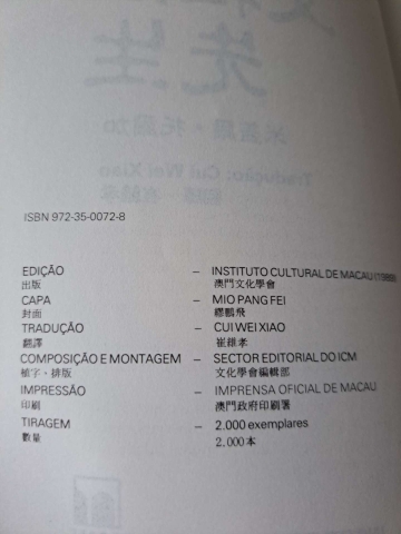 Livro em muito boas condições. Esgotado nas livrarias. Bilingue Chinês-Português. Tiragem limitada a 2000 exemplares. Edição do Instituto Cultural de Macau. Envio grátis em correio editorial normal. Envio em correio registado acresce 2,00 euros. Se tiver alguma dúvida não hesite em perguntar.