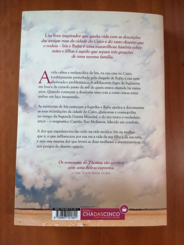 Um livro inspirador que ganha vida com as descrições das antigas ruas da cidade do Cairo e do vasto deserto que o rodeia - Iris e Ruby é uma maravilhosa história sobre mães e filhas e daquilo que separa três gerações de uma mesma família. A vida calma e melancólica de Iris, na sua casa no Cairo, é subitamente perturbada pela chegada de Ruby, a sua neta obstinada e problemática. A adolescente fugiu de Inglaterra em busca de consolo junto da avó de quem estava afastada há vários anos. Quando começam a desabafar uma com a outra cria-se entre ambas um laço inesperado. As memórias de Iris começam a fugir-lhe e Ruby ajuda-a a documentar as suas recordações da cidade do Cairo, glamorosa e cosmopolita no tempo da Segunda Guerra Mundial, e do seu único e verdadeiro amor - o enigmático Capitão Xan Molineux, falecido em combate. A dor que experienciou tão cedo na vida moldou Iris na mulher que é, o que influenciou por sua vez a vida da sua filha e da sua neta, e será esta mesma dor que levará as duas mulheres a aventurarem-se nos perigos do deserto egípcio.