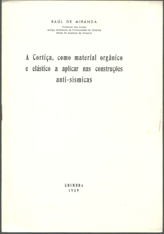 A CORTIÇA, COMO MATERIAL ORGÂNICO E ELÁSTICO A APLICAR NAS CONSTRUÇÕES ANTI-SÍSMICAS. *** Raúl de Miranda [Professor dos Liceus – Antigo Assistente da Universidade de Coimbra – Sócio do Instituto de Coimbra] *** Coimbra: [Sem ind. de editor], 1959. (Tip. da Coimbra Editora, Limitada – Coimbra). (23,5 x 16,5 cm.) com 9 + [1] pp. Capa flexível. Exemplar razoável. Capa com marcas de manuseamento, algumas pequenas manchas e um ligeiro desgaste nas margens e na lombada, onde o agrafo que une as páginas se encontra um pouco oxidado. Globalmente, está ainda em boas condições. Páginas bem conservadas e limpas, apresentando penas um ligeiro amarelecimento e um ou outro pontinho de acidez (raros e de muito reduzida importância), tudo próprio do papel e da passagem do tempo. *** Presumível primeira edição independente, publicada em “Separata de O Instituto, vol. 121.º”, deste breve mas muito curioso estudo (e talvez de surpreendente actualidade) sobre as vantagens da utilização da cortiça nas construções anti-sísmicas. De provável pequena tiragem. *** Portes: envio gratuito em correio normal (tarifa especial para livros) * envio em correio registado: 1,70