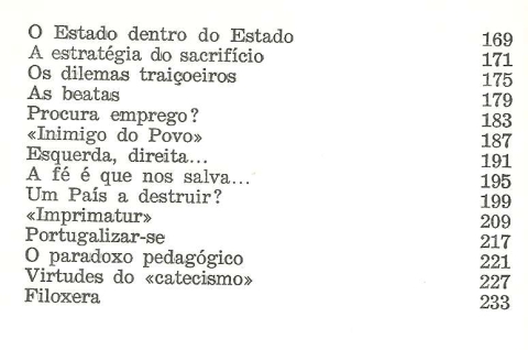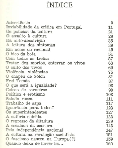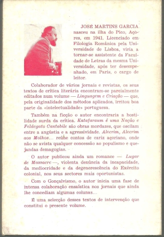 CULTURA , POLÍTICA, INFORMAÇÃO – Um Ano de Luta Contra os Totalitarismos. *** José Martins Garcia *** Lisboa: p&r – Perspectivas & Realidades, 1976. (18,5 x 12,5 cm.) com 235 + [5] pp. Capa flexível. Exemplar razoável. Capa com marcas de manuseamento, algumas manchas ligeiras, pequenas perdas de cor em alguns pontos e um pouco gasta nas margens e na lombada. Apesar de um pouco envelhecida, de um modo geral, está ainda bastante apresentável. Páginas globalmente bem conservadas e limpas, embora apresentem um ligeiro amarelecimento, mais evidente nas primeiras e nas últimas e sobretudo junto das margens. *** Primeira edição deste livro que reúne um conjunto de crónicas publicadas em vários órgãos da imprensa, nas quais o Autor procurou intervir corajosamente contra alguns desmandos resultantes da Revolução de 25 de Abril de 1974. Escreve o Autor na Advertência que abre o volume: «Depois de 25 de Abril de 1974, foram aldrabados e escarnecidos alguns dos homens mais directamente empenhados na queda do anterior regime. Foi-nos difícil avaliar, nos primeiros meses que se seguiram à «libertação», quem era vigarista, quem era ingénuo. Mas, ou por ingenuidade ou por vigarice, os responsáveis políticos permitiram que meia dúzia de pseudo-mártires, amalgamando tortuosos relatos de tortura com a apropriação de documentos vários, se arvorassem em senhores absolutos deste País, em nome de interesses alheios aos do nosso povo. Primeira advertência: as vítimas são suspeitas. Para que a Informação ficasse inteiramente controlada pelas novas forças totalitárias, houve que começar o assalto pelo campo da pseudo-cultura. Aproveitou-se a fama de alguns cantores, em primeiro lugar. Depois, o aventureirismo cultural invadiu a Imprensa. Logo a seguir, a mordaça caiu sobre a Informação. Alguns dos cúmplices dessa degradação continuam bem instalados na máquina governamental, informativa e supostamente cultural. Segunda advertência: eles nunca desistem e, aparentemente inócuos, optam pela infiltração sistemática. Os textos aqui reunidos foram, na sua maioria, publicados em jornais: «A Capital», quando era seu director David Mourão-Ferreira; «Jornal do Fundão», dirigido por António Paulouro (cujo jornal pende agora para outros horizontes...); «A Luta», desde o dia em que conseguiu surgir (e Raul Rêgo, que me conhece, assistiu ao roubo da «República»); «Diário de Notícias», dirigido por Victor Cunha Rego. Também se inclui neste conjunto um texto publicado no número inaugural da revista «Critério», empreendimento cultural que, como é sabido, se deve a João Palma-Ferreira e Alexandre O’Neill.» (Índice nas imagens 3 e 4). *** Portes: envio gratuito em correio normal (tarifa especial para livros) * envio em correio registado: 1,70