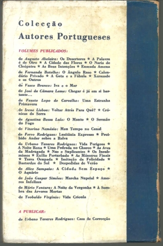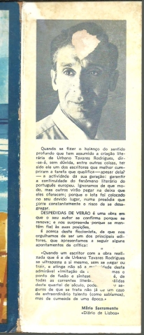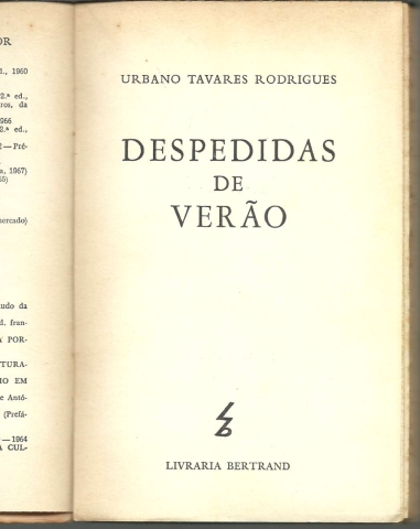DESPEDIDAS DE VERÃO. *** Urbano Tavares Rodrigues *** [Sem ind. de local: Lisboa (?)]: Livraria Bertrand, [1967]. Colecção Autores Portugueses. (19 x 12,5 cm.) com 174 + [2] pp. Capa flexível, com badanas. Exemplar razoável. Capa com marcas de manuseamento, manchas de acidez, pequenas perdas de cor em alguns pontos, vincos, ligeiramente empoeirada e um pouco gasta nas margens e na lombada. Apresenta esfoladelas na parte de dentro e nas badanas (onde prejudicaram a parte impressa), que devem ter resultado de pedaços de fita-cola aplicados aí para fixar alguma sobrecapa de protecção, que depois terá sido removida. Globalmente está envelhecida e um pouco cansada, mas ainda apresentável. Páginas em bom estado e limpas, embora apresentem um tom amarelecido (um pouco mais forte nas margens) e as primeiras e as últimas mostrem um tom escurecido e manchas de acidez ténues, especialmente na área em que contactam com as badanas. *** Primeira edição deste livro que resulta de um esboço para um argumento cinematográfico, a partir de uma ideia de Jorge Brum do Canto, «longinquamente relacionado com o mito de Fedra» e «em que deveriam intervir uma actriz, à volta dos quarenta anos, e um jovem», argumento que tinha em vista a realização de «um filme que, por tristes e ao mesmo tempo picarescas razões, não chegou a fazer-se.» Capa de José Cândido. *** Portes: envio gratuito em correio normal (tarifa especial para livros) * envio em correio registado: 1,70