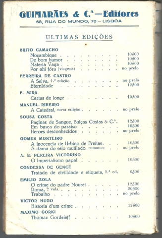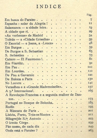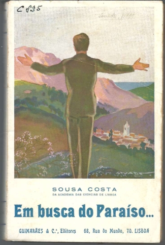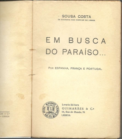 EM BUSCA DO PARAÍSO... Por Espanha, França e Portugal. *** Sousa Costa [Da Academia das Ciencias de Lisboa] *** Lisboa: Livraria Editora Guimarães & C.ª, 1934. (19 x 12 cm.) com 265 + [7] pp. Capa flexível. Exemplar razoável. Capa com marcas de manuseamento, algumas manchas, vincos e um pouco gasta nas margens e na lombada, que apresenta alguns rasgões e vincos de abertura. Junto da margem superior da capa da frente tem pequenas anotações a tinta e a lápis. Na parte de dentro, também da capa da frente, tem um ex-líbris. Globalmente, apesar de acusar o uso e algum envelhecimento, está ainda apresentável. Páginas bem conservadas e limpas, embora apresentem um tom amarelecido e algumas manchas de acidez (raras, concentrando-se sobretudo nas primeiras e nas últimas). No canto superior direito da primeira página tem um número manuscrito. *** Primeira edição deste livro que regista impressões de viagem do Autor por Espanha, França e Portugal. (Índice na imagem 4). Capa de Stuart. *** Portes: envio gratuito em correio normal (tarifa especial para livros) * envio em correio registado: 1,70