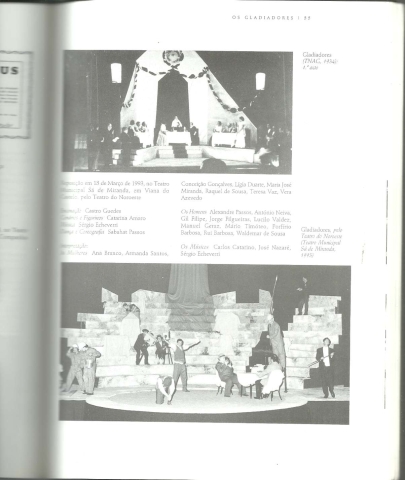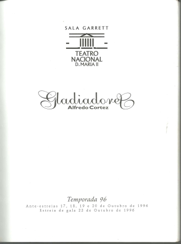 Sala Garrett – Teatro Nacional D. Maria II: GLADIADORES – Alfredo Cortez. Temporada 96. Ante-estreias 17, 18, 19 e 20 de Outubro de 1996. Estreia de gala 22 de Outubro de 1996. *** Coordenação do Programa: Júlio de Magalhães *** Fotos: Arquivo TNDM II – Maria Luísa Gomes – Museu Nacional do Teatro – Teatro Experimental do Porto – Teatro do Noroeste *** Lisboa: Teatro Nacional D. Maria II, [1996]. (24 x 18 cm.) com 109 + [3] pp. Com várias ilustrações a p/b.. Capa flexível. Exemplar razoável. Capa com marcas de manuseamento e um pequeno desgaste nas margens (e especialmente nos cantos exteriores), mas, de um modo geral, ainda em boas condições e limpa. Páginas em bom estado e limpas, embora apresentem algumas marcas de uso, que se traduzem sobretudo por um pequenos desgaste dos cantos exteriores das primeiras e das últimas. *** Primeira edição do programa relativo à apresentação, na Sala Garrett do Teatro Nacional D. Maria II, da peça Gladiadores, de Alfredo Cortez, encenada por Artur Ramos e que seria também transmitida na RTP, integrando-se nas comemorações dos 150 anos do Teatro Nacional D. Maria II e nos 40 anos da RTP. Além da ficha técnica do espectáculo, do elenco (de que se apresentam também breves biografias artísticas) e de textos de apresentação (por Carlos Avilez e Manuel Roque), o livro inclui interessantes textos alusivos à peça e ao seu Autor (Recados do encenador, por Artur Ramos; Um “Reclamo” chamado jornalismo?, por Artur Portela; O mérito da modernidade de Gladiadores, por Duarte Ivo Cruz; Gladiadores, 1934, por José-Augusto França; Nota sobre Gladiadores de Alfredo Cortez, por Luiz Francisco Rebello; Alfredo Cortez: uma dramaturgia de rosto humano, por Júlio de Magalhães), informações sobre as Principais representações das peças de Alfredo Cortez e um amplo dossier sobre “Gladiadores” e a crítica, terminando com depoimentos de Artur Ramos (Teatro e Televisão e vice-versa) e António Silva (Teatro na Televisão), a propósito das comemorações do 150.º aniversário do Teatro Nacional D. Maria II e do 40.º aniversário da Radiotelevisão Portuguesa. *** Portes: envio gratuito em correio normal (tarifa especial para livros) * envio em correio registado: 1,70