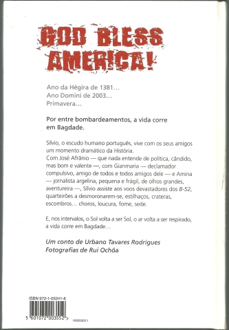 GOD BLESS AMERICA! *** Urbano Tavares Rodrigues *** Fotografias de Rui Ochôa *** Mem Martins: Publicações Europa-América, Lda., 2003. (23 x 15,5 cm.) com 64 + [8] pp. Com várias ilustrações a cores. Capa dura. Bom exemplar. Capa com ligeiras marcas de manuseamento, encontrando-se bem conservada e limpa. Páginas em bom estado e limpas. *** Primeira edição deste livro, publicado no ano em que se assinalava o 50.º aniversário de vida literária de Urbano Tavares Rodrigues, e no qual o Autor, num misto de conto e reportagem jornalística, capta uma imagem da vida em Bagdad em plena Guerra do Iraque, acompanhado pelas fotografias de Rui Ochôa. *** Portes: envio gratuito em correio normal (tarifa especial para livros) * envio em correio registado: 1,70