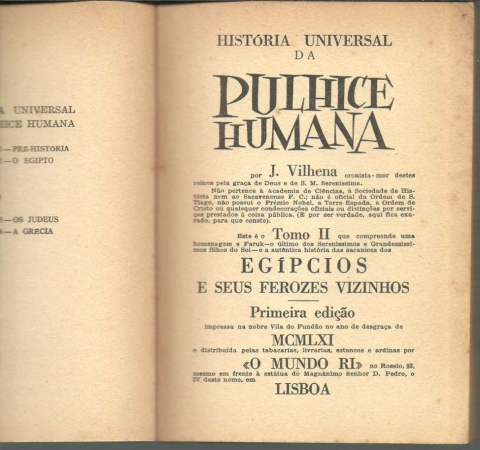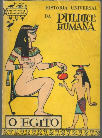 HISTÓRIA UNIVERSAL DA PULHICE HUMANA por J. Vilhena cronista-mor destes reinos pela graça de Deus e da S. M. Sereníssima. Não pertence à Academia das Ciências, à Sociedade de História nem ao Sacavenense F. C.; não é oficial da Ordem de S. Tiago, não possui o Prémio Nobel, a Torre Espada, a Ordem de Cristo ou quaisquer condecorações oficiais ou distinções por serviços prestados à coisa pública. (E por ser verdade, aqui fica exarado, para que conste). Este é o Tomo II que compreende uma homenagem a Faruk – o último dos Sereníssimos e Grandessíssimos filhos do Sol – e a autêntica história das sacanices dos EGÍPCIOS E SEUS FEROZES VIZINHOS. Primeira edição impressa na nobre Vila do Fundão no ano da desgraça de MCMLXi e distribuída pelas tabacarias, livrarias, estancos e ardinas por «O MUNDO RI» no Rossio, 93, mesmo em frente à estátua do Magnânimo Senhor D. Pedro, o IV deste nome, em LISBOA. *** Lisboa: Edição do Autor, 1961. [Distribuidores exclusivos: «O Mundo Ri» – Lisboa]. (Tip. de «Jornal do Fundão» – Fundão). (17 x 12,5 cm.) com 148 + [4] pp. Com várias ilustrações a p/b.. Capa flexível. Exemplar razoável. Capa envelhecida, com evidentes marcas de manuseamento, vincos, manchas e um pouco gasta nas margens e na lombada. Apesar de tudo, globalmente, está ainda apresentável. Páginas em relativo bom estado, embora apresentem um tom amarelecido (um pouco mais forte nas margens) e manchas de acidez, algo frequentes, embora se concentrem sobretudo junto das margens. *** Primeira edição do segundo volume da História da Pulhice Humana, de José Vilhena, que, apesar de estar inicialmente programada para mais volumes, não foi além do terceiro, incluindo além deste, o 1.º Volume (Pré-História) e o 3.º volume (Os Judeus). É um dos primeiros livrinhos da vasta bibliografia de teor humorístico de José Vilhena. *** Portes: envio gratuito em correio normal (tarifa especial para livros) * envio em correio registado: 1,70