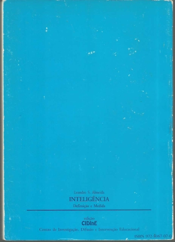 INTELIGÊNCIA: DEFINIÇÃO E MEDIDA. *** Leandro S. Almeida *** Prefácio: José Tavares *** Aveiro: CIDInE – Centro de Investigação, Difusão e Intervenção Educacional, 1994. (24 x 17 cm.) com 150 + [2] pp. Capa flexível. Exemplar razoável. Capa com evidentes marcas de manuseamento, pequenas perdas de cor em alguns pontos, vincos discretos e um pouco gasta nas margens e na lombada. Apesar de tudo, de um modo geral, está ainda apresentável. Páginas globalmente bem conservadas e limpas, mas apresentando um ligeiro amarelecimento nas margens e algumas marcas de uso, que se traduzem sobretudo por um pequeno desgaste nos cantos exteriores das primeiras e das últimas. Tem, no entanto, uma assinatura de posse e uma data manuscrita no canto superior direito da primeira página. *** Primeira edição desta obra que procura, mais do que dar respostas, fazer um ponto de situação em torno de um problema muito complexo e de difícil objectivação: o que é a inteligência e qual a viabilidade ou a fiabilidade dos seus instrumentos de medida, os testes. Lê-se no início do prefácio: «O livro Inteligência: definição e medida que, a seguir, se publica é o resultado de um trabalho de investigação que o autor vem desenvolvendo de há vários anos a esta parte, já deu origem a outras publicações e serviu de base à lição apresentada nas suas provas de agregação. Trata-se efectivamente de um tema que apesar dos muitos estudos e pesquisas levados a cabo e que são referidos de uma maneira quase exaustiva, a sua definição e medida, de certo modo, continua por fazer à espera de outros instrumentos que, por sua vez, só será possível elaborar com base em outras definições, talvez com um maior grau de fiabilidade e adequação, se admitirmos que qualquer medida de inteligência que se pretenda terá sempre que partir de uma determinada concepção da mesma. Parece ser este o círculo vicioso, que está presente em todas as tentativas de definição e medição da inteligência que têm sido realizadas originando as diferentes teorias que foram aparecendo, no decorrer dos tempos, recebidas pelos especialistas na matéria com mais ou menos entusiasmo.» (Índice nas imagens 3 e 4). *** Portes: envio gratuito em correio normal (tarifa especial para livros) * envio em correio registado: 1,70