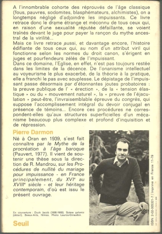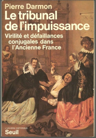 LE TRIBUNAL DE L’IMPUISSANCE. Virilité et Défaillances Conjugales dans l’Ancienne France. *** Pierre Darmon ***[Paris]: Éditions du Seuil, 1979. Colecção: L’Univers Historique. (20,5 x 14 cm.) com 310 + [10] pp. Capa flexível. Exemplar razoável. Capa com marcas de manuseamento, um pouco escurecida e com manchas de acidez (algo visível praticamente apenas no lado de dentro), alguns discretos vincos de pressão e um pequeno desgaste nas margens e na lombada, que apresenta também vincos de abertura ligeiros. Globalmente, apesar de um pouco envelhecida, está ainda muito apresentável. Páginas, de um modo geral, em bom estado e limpas, embora apresentem um tom amarelecido e pequenas manchas de acidez, que se concentram sobretudo nas primeiras e nas últimas, devendo-se tudo, em grande medida, à qualidade do papel utilizado. *** Primeira edição deste curioso estudo sobre a impotência sexual e as suas consequências socias (e jurídico-legais) na França antiga (essencialmente, do século XVI ao século XVIII). Em jeito de sinopse, e numa tradução muito livre, lê-se na contracapa: «Na incontável legião de marginalizados da época clássica (os loucos, os pobres, os sodomitas, os blasfemos, os alquimistas), os impotentes foram durante muito tempo negligenciados. Este livro narra, portanto, o estranho e pouco conhecido drama de todos aqueles que, por causa de uma suposta deficiência sexual, se viram postos perante o juiz para pagar o preço pelo mito ancestral da virilidade. Mas este livro narra também, e mais ainda, a edificante história de todos aqueles que, em nome de um atributo viril que funciona segundo as normas do direito canónico, se autoproclamaram juízes e zelosos perseguidores dos impotentes. Neste domínio, a Igreja, de facto, nem sempre se manteve dentro dos limites da decência. Da masturbação intelectual ao voyeurismo mais extremo, da teoria à prática, ela ultrapassou os limites com facilidade. A detecção da impotência envolvia concursos probatórios surpreendentes: prova pública de "erecção", "tensão elástica" ou "movimento natural", talvez mesmo "prova de ejaculação", e até o incrível teste do “consórcio”, que pressupunha o cumprimento integral do dever conjugal na presença de testemunhas... No entanto, estes procedimentos correspondem apenas às estruturas superficiais de um mecanismo de inquisição e repressão muito mais complexo e profundo.» (Na imagem 4 está apenas o começo do índice, que ocupa mais duas páginas). Texto em francês. Pouco comum. *** Portes: envio gratuito em correio normal (tarifa especial para livros) * envio em correio registado: 1,70