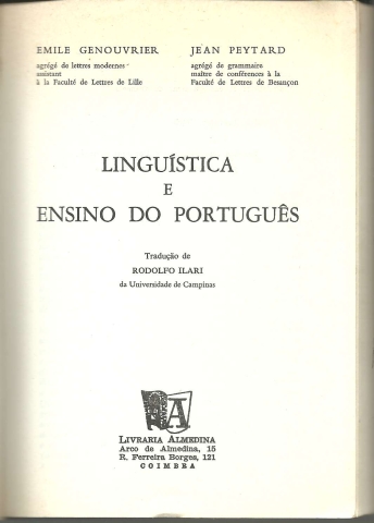 LINGUÍSTICA E ENSINO DO PORTUGUÊS. *** Emile Genouvrier [agrégé de lettres modernes assistant à la Faculté de Lettres de Lille] – Jean Peytard [agrégé de grammaire maître de conférences à la Faculté de Lettres de Besançon] *** Tradução de Rodolfo Ilari [da Universidade de Campinas] *** Título original: Linguistique et enseignement du français *** Coimbra: Livraria Almedina, 1974. Colecção Almedina – 20. (19 x 13 cm.) com 443 + [5] pp. Capa flexível. Exemplar razoável. Capa com marcas de manuseamento, vincos e um pouco gasta e amarelecida nas margens e na lombada, que apresenta também vincos de abertura. Globalmente, apesar de acusar o uso e algum envelhecimento, está ainda apresentável. Páginas, de um modo geral, em bom estado e limpas, embora apresentem alguns sinais de uso, um tom amarelecido e uma ou outra pequena mancha de acidez (pouco frequentes e incidindo sobretudo nos cortes). No anterrosto tem uma pequena área um pouco gasta, onde provavelmente foi apagada uma assinatura ou inscrição manuscrita, mas que passa bastante despercebida. Tem uma pequena etiqueta de livraria colada na primeira página. *** Primeira edição portuguesa deste livro que, como se lê na “Nota prévia”, «pretende, antes de mais nada, sanar uma falha de informação frequente em nossos estudantes de letras: é sabido que os cursos de linguística ministrados nas faculdades de filosofia, quando não se confundem com um tratamento histórico-filológico de textos arcaicos, dificilmente vão além da discussão – legítima mas limitada – de poucos textos básicos, ou se perdem no exame perfunctório de campos de análise particulares (geralmente a fonologia); outras vezes a linguística é a pátria distante de noções misteriosas que povoam hoje a análise literária... Tudo isso é válido mas parcial: e a leitura do presente texto deveria permitir integrar as noções já aprendidas num quadro completo dos estudos sobre linguagem.» (O índice é extremamente longo, ocupando treze páginas, pelo que na imagem 4 está apenas o início). *** Portes: envio gratuito em correio normal (tarifa especial para livros) * envio em correio registado: 1,70
