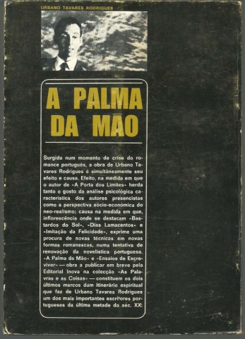 A PALMA DA MÃO. Sumário dos Dias Inquietos. *** Urbano Tavares Rodrigues *** Porto: Editorial Inova Limitada, 1970. Colecção: Ofício de Viver – 8. (19,5 x 14 cm.) com 262 + [10] pp. Capa flexível, com badanas. Exemplar razoável. Capa com marcas de manuseamento, pequenas perdas de cor em alguns pontos, vincos e um pouco gasta nas margens e na lombada, que apresenta também vincos de abertura. Conserva a cinta publicitária, que se encontra, no entanto, um pouco danificada na parte que corresponde à lombada, onde faltam pedaços de papel nas extremidades. Apesar de envelhecida e um pouco gasta, está ainda muito apresentável. Páginas globalmente bem conservadas e limpas, embora apresentem um tom amarelecido e algumas manchas de acidez, que incidem sobretudo nos cortes. *** Primeira edição deste livro de Urbano Tavares Rodrigues, «um volume que nos fala das mil e uma coisas dispersas que preenchem o mundo em que vivemos e que constituem as nossas preocupações quotidianas, por onde peregrina o pensamento do autor. «A Palma da Mão» de Urbano Tavares Rodrigues está cheia de coisas. Quando a abre, surgem histórias de criança, histórias passadas, presentes pelo significado e pela beleza poética, histórias da juventude das «horas verdes do Jardim da Estrela», pedaços recuperados da vida do autor; histórias de sempre, como «O Eterno Sapatinho de Bailado»; histórias actuais-futuras: a nova Universidade, a definição de Democracia, a automatização. Com «A Palma da Mão», Urbano Tavares Rodrigues delimita o seu ângulo de inserção no mundo: escritor atento e actuante, preocupa-se com tudo, dá conta de tudo: da crítica literária ao turismo e ao conflito Israelo-árabe, sem esquecer o «dilúvio» de Maio. A destacar, três notas fundamentais: Uma posição de princípio – a esperança inextinguível de quem está vivo porque encontra a vida na teia das coisas; Um método – a crítica imperturbável e segura, expressivamente ilustrada no artigo «Vinicius de Morais, a Que Destino Assistes?...»: (Mas que ideia, Vinícius!); Uma interrogação permanente e impulsionadora: «E, afinal, o que é o puro e o impuro?» Por isto, e também porque constitui um demonstração do empenhamento decidido de Urbano Tavares Rodrigues na humanização do mundo, «A Palma da Mão» fica a ocupar um lugar importante na bibliografia do seu autor. Daí também o valor e a actualidade da sua leitura.» (Índice nas imagens 3 e 4). Capa e direcção gráfica de Armando Alves. *** Portes: envio gratuito em correio normal (tarifa especial para livros) * envio em correio registado: 1,70