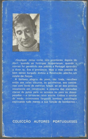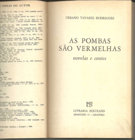 AS POMBAS SÃO VERMELHAS. Novelas e Contos. *** Urbano Tavares Rodrigues *** Amadora: Livraria Bertrand, 1977. Colecção Autores Portugueses. (19 x 12 cm.) com 166 + [2] pp. Capa flexível, com badanas. Exemplar razoável. Capa com marcas de manuseamento, vincos, manchas de acidez, pequenas perdas de cor em alguns pontos e um pouco gasta nas margens e na lombada. Apesar de envelhecida e um pouco gasta, de um modo geral, está ainda apresentável. Páginas globalmente bem conservadas e limpas, embora apresentem um tom amarelecido (um pouco mais forte nas margens) e manchas de acidez, que se concentram sobretudo nas primeiras e nas últimas, certamente devido ao contacto com a parte de dentro da capa. *** Primeira edição deste livro no qual o Autor reuniu um conjunto de novelas e contos, de algum modo alimentados pela Revolução de 25 de Abril de 1974. Escreve Urbano Tavares Rodrigues: «Do ciclo da Revolução são as três narrativas «As Pombas São Vermelhas», «O Morador do Vão da Escada» e «A Noite da Vitória em Forma de Interrogação». Porém, as outras histórias curtas, respigadas de publicações várias, não o foram apenas para enchumaçar o volume, mas porque nelas encontrei, embora datem de antes do 25 de Abril, a mesma revolta e a mesma esperança fundamentais, o leve, leve que seja, clarão de sol, quero dizer de amor, pelo qual vale a pena existir.» (Índice na imagem 4).*** Portes: envio gratuito em correio normal (tarifa especial para livros) * envio em correio registado: 1,70