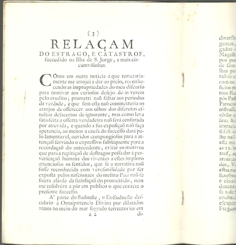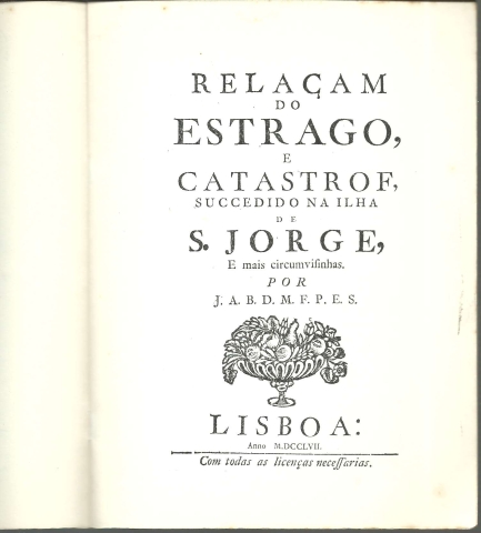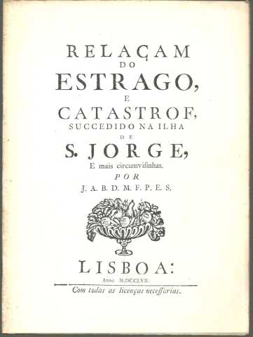 RELAÇAM DO ESTRAGO, E CATASTROF, SUCCEDIDO NA ILHA DE S. JORGE, E mais circumvisinhas. *** Por J. A. B. D. M. F. P. E. S. *** [Sem ind. de local: Ponta Delgada (?)]: [sem ind. de editor], 1977. (Tip. Insular – 2/77 – [Ponta Delgada]). (21 x 15,5 cm.) com [12] pp. (numeradas de [3] + 7 + [2]). Com ilustrações a p/b.. capa flexível. Exemplar razoável. Capa com marcas de manuseamento, algumas manchas, e um pequeno desgaste nas margens e na lombada, que se encontram também algo amarelecidas. Os agrafos que unem as páginas encontram-se um pouco oxidados. Globalmente, apesar de um pouco envelhecida, está ainda bastante apresentável. Páginas bem conservadas e limpas, embora apresentem um tom amarelecido e algumas pequenas manchas de acidez (pouco frequentes e de reduzida importância). *** Trata-se da reprodução (talvez, a primeira e única) da edição de Lisboa, de 1757 de um raríssimo opúsculo que dá conta Tem na primeira página um carimbo com a indicação de “Tiragem única de 500 exemplares”, levando este o n.º 354. O Autor relata os efeitos do grande sismo (que ficou conhecido como Mandado de Deus) e maremoto que a 9 de Julho de 1757 abalou a ilha de São Jorge, nos Açores, e as ilhas vizinhas, causando nelas grande destruição e a morte de cerca de 1500 pessoas. A ilha de São Jorge foi a mais atingida e no texto são fornecidos detalhes sobre a destruição de muitas povoações e as acções de Manuel Rodrigues Pereira e do Bispo Valério do Nascimento. Texto fac-similado em português da época. Muito invulgar. *** Portes: envio gratuito em correio normal (tarifa especial para livros) * envio em correio registado: 1,70