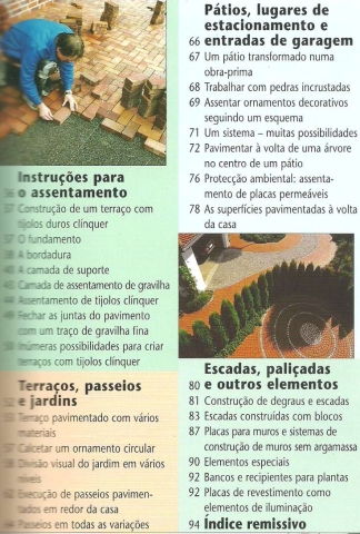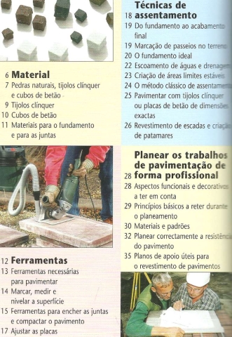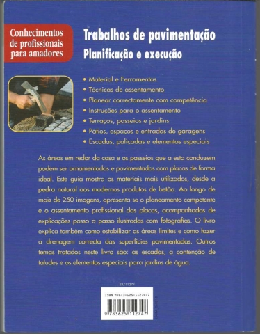 TRABALHOS DE PAVIMENTAÇÂO – PLANIFICAÇÃO E EXECUÇÃO. Com explicações passo a passo... *** [Sem ind. de autor] *** Produção completa: Naumann & Göbel Verlagsgesellschaft mbH *** [Sem ind. de local]: [Sem ind. de editor: Naumann & Göbel Verlagsgesellschaft mbH (?)], [Sem ind. de ano: 2005 (?)]. (22,5 x 17 cm.) com 95 + [1] pp. Profusamente ilustrado a cores. Capa flexível. Bom exemplar. Capa com pequenas marcas de manuseamento e um ligeiro desgaste nas margens, mas encontrando-se ainda em bom estado e limpa. Páginas bem conservadas e limpas. *** Presumível primeira edição portuguesa deste guia prático que pretende divulgar “conhecimentos de profissionais para amadores”, a respeito da planificação e execução de trabalhos de pavimentação aplicáveis em terraços, passeios, jardins, pátios, entradas de garagens, etc. Lê-se na contracapa: «As áreas em redor da casa e os passeios que a esta conduzem podem ser ornamentados e pavimentados com placas de forma ideal. Este guia mostra os materiais mais utilizados, desde a pedra natural aos modernos produtos de betão. Ao longo de mais de 250 imagens, apresenta-se o planeamento competente e o assentamento profissional das placas, acompanhados de explicações passo a passo ilustradas com fotografias. O livro explica também como estabilizar as áreas limites e como fazer a drenagem correcta das superfícies pavimentadas. Outros temas tratados neste livro são: as escadas, a contenção de taludes e os elementos especiais para jardins de água.» (Índice nas imagens 3 e 4). *** Portes: envio gratuito em correio normal (tarifa especial para livros) * envio em correio registado: 1,70