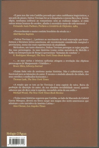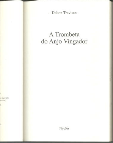 A TROMBETA DO ANJO VINGADOR. *** Dalton Trevisan *** Revisão de texto: Michelle Nobre Dias e Anabela Prates Carvalho *** Lisboa: Relógio D’Água Editores, [2013]. Colecção: Ficções. (23,5 x 15 cm.) com 115 + [13] pp. Capa flexível, com badanas. Bom exemplar. Capa com ligeiras marcas de manuseamento, algumas manchas de acidez (só visíveis no lado de dentro) e um leve desgaste nas margens, mas encontrando-se ainda em bom estado e limpa. Páginas bem conservadas e limpas, apresentando apenas um ligeiro amarelecimento e alguns pontinhos de acidez (ténues, raros e de muito reduzida importância). Tem uma pequena etiqueta de livraria colada na primeira página. *** Primeira edição portuguesa deste livro de contos de Dalton Trevisan, por muitos considerado o maior contista brasileiro do século XX. (Índice na imagem 4). *** Portes: envio gratuito em correio normal (tarifa especial para livros) * envio em correio registado: 1,70