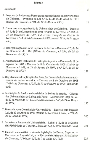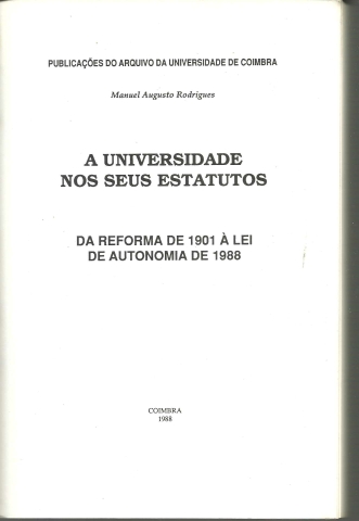 A UNIVERSIDADE NOS SEUS ESTATUTOS. Da Reforma de 1901 à Lei de Autonomia de 1988. *** Manuel Augusto Rodrigues *** Coimbra: Publicações do Arquivo da Universidade de Coimbra, 1988. Colecção: Universitatis Conimbrigensis Historiae Fontes et Subsidia – [1]. (26 x 17,5 cm.) com 618 + [2] pp. Capa flexível. Exemplar razoável. Capa com marcas de manuseamento, algumas manchas (que se concentram sobretudo na lombada), pequenas áreas superficialmente roídas pela traça, ligeiras perdas de cor em alguns pontos e um pouco gasta nas margens e na lombada. Apesar de tudo, globalmente, está ainda muito apresentável. Páginas bem conservadas e limpas. *** Primeira edição desta obra que passa em revista os Estatutos e outra legislação relativa à Universidade de Coimbra, que inaugurou a colecção “Vniuersitatis Conimbrigensis Historiae Fontes et Svbsidia”, com a qual o Arquivo da Universidade de Coimbra pretendeu celebrar o 7.º centenário da Fundação da Universidade de Coimbra. Lê-se no início da Introdução: «A Reforma de 1901, ou mais precisamente o Decreto n.º 4, de 24 de Dezembro de 1901, pode considerar-se no nosso século [XX] o ponto de partida de uma série de tentativas de reorganização do ensino superior, que vieram a culminar com a aprovação da Lei de Autonomia ocorrida há pouco tempo. Como se verá foram vários os Estatutos e outra legislação aparecida desde aquela data até aos nossos dias». (O índice ocupa três páginas, pelo que na imagem 4 está apenas o começo). *** Portes: envio gratuito em correio normal (tarifa especial para livros) * envio em correio registado: 1,70