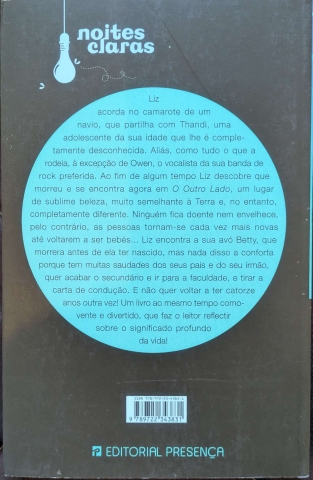 Liz acorda no camarote de um navio, que partilha com Thandi, uma adolescente da sua idade que lhe é completamente desconhecida. Aliás, como tudo o que a rodeia, à excepção de Owen, o vocalista da sua banda de rock preferida. Ao fim de algum tempo Liz descobre que morreu e se encontra agora em O Outro Lado, um lugar de sublime beleza, muito semelhante à Terra e, no entanto, completamente diferente. Ninguém fica doente nem envelhece, pelo contrário, as pessoas tornam-se cada vez mais novas até voltarem a ser bebés... Liz encontra a sua avó Betty, que morrera antes de ela ter nascido, mas nada disso a conforta porque tem muitas saudades dos seus pais e do seu irmão, quer acabar o secundário e ir para a faculdade, e tirar a carta de condução. E não quer voltar a ter catorze anos outra vez! Um livro ao mesmo tempo como- vente e divertido, que faz o leitor reflectir sobre o significado profundo da vida!