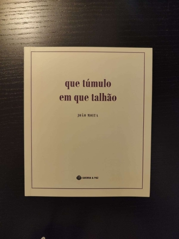 Depois de Uma Pedra sobre a Boca, o poeta João Moita evoca cenários da vila ribatejana de Alpiarça, sua terra natal, em Que Túmulo em Que Talhão. Levanta-se destes poemas uma natureza indiferente ao humano. O sujeito enunciador retrai-se, quase desaparece. Sobram quadros de uma inusitada beleza, paisagens percorridas pela lente impiedosa de uma câmara. A única transcendência é a da putrefacção. Escuta-se o murmúrio feroz da terra e dos bichos. A esclerose alastra por uma vila fossilizada. Alguém procura algures um túmulo, perdido entre talhões.