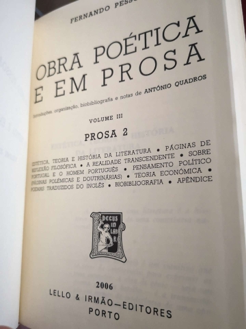 O resto do primeiro volume contém a antologia poética, sendo o segundo e o terceiro dedicados à prosaica: «Páginas Íntimas», «Cartas», «Ficção», «Textos de Intervenção na Vida Cultural e Literária Portuguesa» (vol.II)