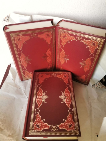 Edição monumental em papel-bíblia, com encadernação em pele profusamente gravada a ouro na lombada e na pasta superior.