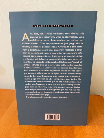 Em 1994 surgia, na Editorial Presença com o romance Dramaticamente Vestida de Negro. Agora reaparece com três mulheres, três vozes e uma mesma história com três finais diferentes. Onde reside então a verdade? Essa, diz respeito ao leitor, que joga e é jogado pela força da narrativa irónica e ambígua, desta grande referência da literatura portuguesa contemporânea. O mais recente título de Fernanda Botelho, de novo com chanela da Presença.