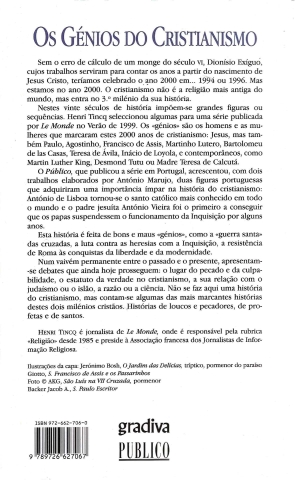 Sem o erro de cálculo de um monge do século VI, Dionísio Exíguo, cujos trabalhos serviram para contar os anos a partir do nascimento de Jesus Cristo, teríamos celebrado o ano 2000 em... 1994 ou 1996. Mas estamos no ano 2000. O cristianismo não é a religião mais antiga do mundo, mas entra no 3º milénio da sua história. Nestes vinte séculos de história impõem-se grandes figuras ou sequências. Henri Tincq selecionou algumas para uma série publicada por Le Monde no Verão de 1999. Os «génios» são os homens e as mulheres que marcaram estes 2000 anos de cristianismo: