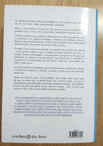 Alimentação, sono, crescimento, higiene, desenvolvimento, educação, escola, brincar, sexualidade, acidentes, saúde. Ter dúvidas é próprio da parentalidade ou não vivia o ser mãe e o ser pai com amor, afeto, preocupação e interesse. Mais, o crescimento e o percurso de vida da criança revelam-se por questões que, no dia a dia, incomodam, perturbam e causam stresse. Ter filhos também é isso: ganhar cabelos brancos. Mas se pudermos viver o quotidiano com menos ansiedade, viveremos mais felizes e teremos tempo e disponibilidade para investir noutros aspetos mais interessantes deste fantástico fenómeno de sermos mães ou pais. Durante muitos anos fui escutando as questões que os pais me traziam - e fico grato a todos os que o fizeram, porque confiaram em mim - e recebo e-mails e mensagens com perguntas, que para muitas pessoas poderiam ser banais e «comezinhas», mas que ficam a «morder» e prejudicam a tranquilidade da vida diária. Como pai, sei também «na pele» o que isso é. A minha função como pediatra, para lá de promover a saúde das crianças e identificar e prevenir a doença, é ajudar os pais a ter uma parentalidade feliz e gostosa. Neste livro decidi reunir 1333 questões. São muitas. Mas estou certo de que, ao lerem-nas, se identificarão com a maioria delas. Do sono à alimentação, passando pelo crescimento e desenvolvimento, sexualidade, brincar, escola e educação, birras, vacinas, amigos. Bom, já viram que os temas são muitos e que justificam tantas questões. São 1333 perguntas, mas podiam, certamente, ser muitas mais.