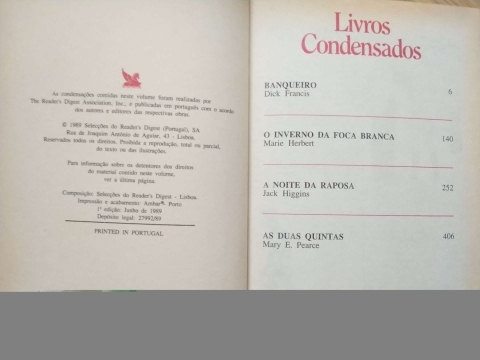 Livro condensado pelas Selecções do Reader's Digest, com 4 best-sellers da literatura internacional: "Banqueiro" de Dick Francis; "O Inverno da Foca Branca" de Marie Herbert; "A Noite da Raposa" de Jack Higgins; "As Duas Quintas" de Mary E. Pearce.