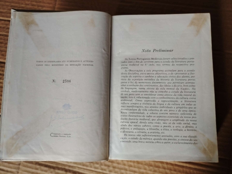 Textos Portugueses Medievais - 3.º Ciclo dos Liceus. Aprovado oficialmente como livro único (Diário do Governo, II série, de 25 de Maio de 1964). Exemplar numerado (N.º 2506) e autenticado pelo Ministério da Educação Nacional.